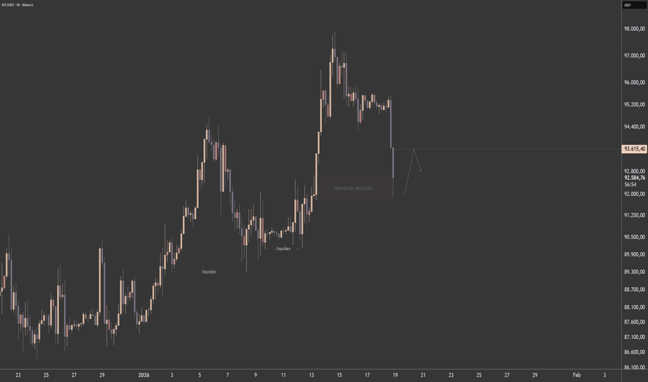 Bitcoin - Momentos de desiciónEn continuidad con la lectura de liquidez planteada en el análisis anterior, el precio de Bitcoin se encuentra actualmente en una zona clara de decisión, donde el mercado deberá definir dirección.