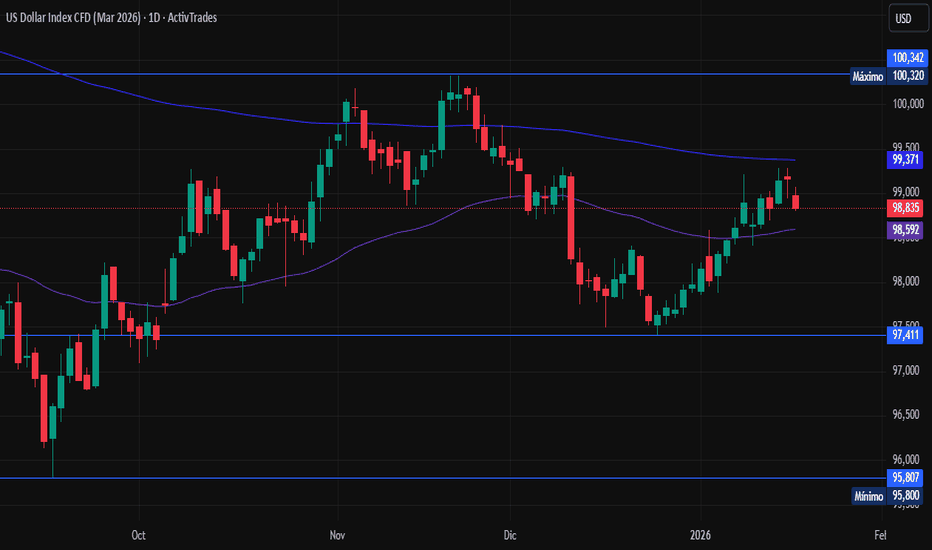 El índice del dólar, atrapado en medias móviles El índice del dólar ha estado retrocediendo al alza desde el mínimo en el 97,41, hasta llegar a romper por encima de la media móvil exponencial (EMA) de 55 días, línea morada, y la media móvil exponencial de 200 días, línea azul.