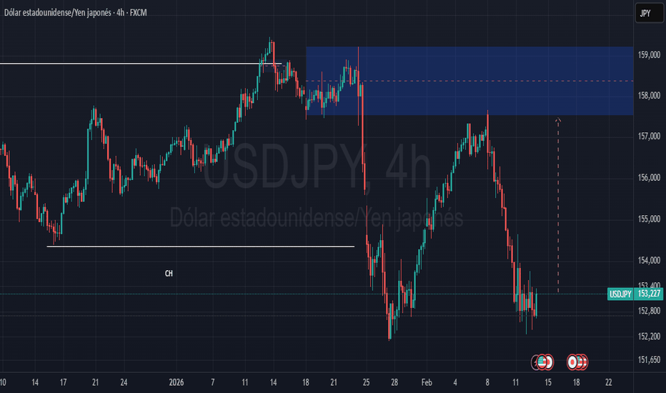 Contexto de Mercado: El par USDJPY se encuentra en una zona clave de soporte en el marco temporal de 4 horas. Después de una fuerte caída, el precio ahora se está consolidando en torno a los 153,275, un nivel que ha actuado como soporte y res