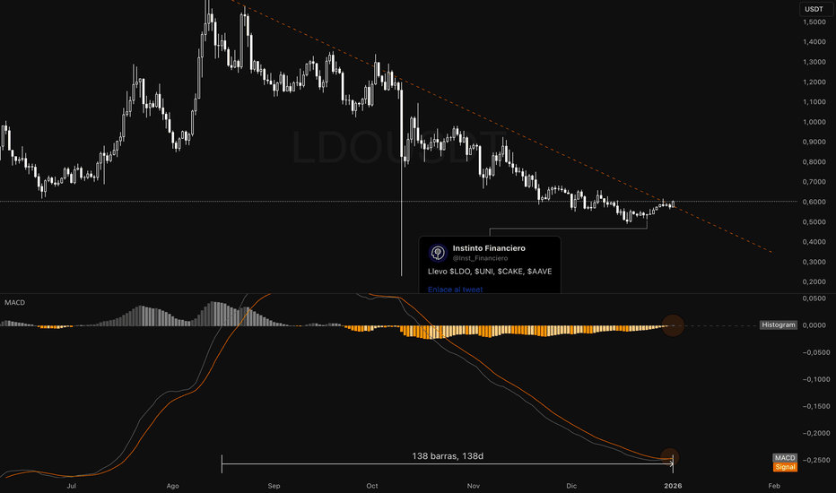 ¿$LDO dando señal de reversión?El gráfico muestra una tendencia bajista fuerte , con la línea de tendencia actuando como resistencia. El MACD bearish sugiere que la momentum es negativo , y una continuación bajista podría llevar el precio por debajo de 0.60 USD si no hay reversión. Sin embargo, hay posibilidades de subida si: