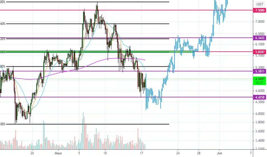 Largo en la criptomoneda 1INCH, la entrada es en cuando se testee la resistencia y se convierta en soporte la zona del 50% del fibonacci la cual concuerda con un soporte y resistencia en temporalidad diaria, teniendo en cuenta el patron de velas en la subida anterior y copiando ese mismo patron al precio actual nos concuerda con dicha zona como posible entrada.