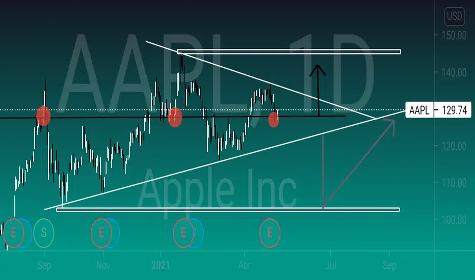 Apple en un triángulo de consolidacion específico en el gráfico las posibles acciones del precio usando la teoría y la experiencia .