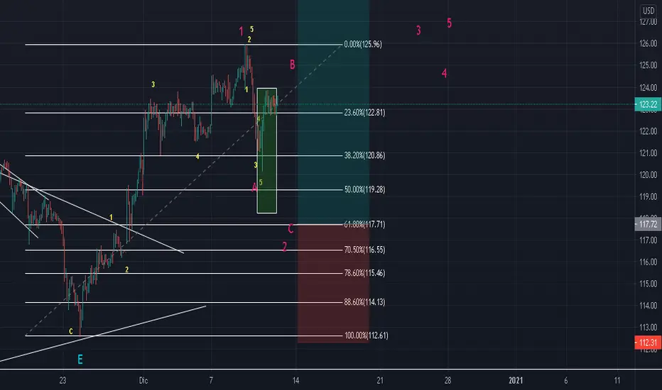 Antes de que finalice el triangulo envié una idea de compra que no llego a tocar el buy limit. Igualmente yo llegue a tomarla porque le di seguimiento. Ya finalizo el triangulo de la onda 4 y ahora tenemos este posible 1-2 donde se esta formando un posible Zig Zag, trace un fibo desde el inicio del impulso hasta el final de la onda 1, luego tome la medida de la onda 1 y casi toca el 61.8%. Donde me parece un buen punto para tomar la onda 3 que tiene altas posibilidades de extenderse. el SL lo ponemos abajo de la onda 1 por que si el precio me supera ese punto me invalida mi conteo alcista. En caso de que la onda C se extienda voy a ir actualizando la idea. Por el momento el 61.8% me parece un buen punto para entrar.
