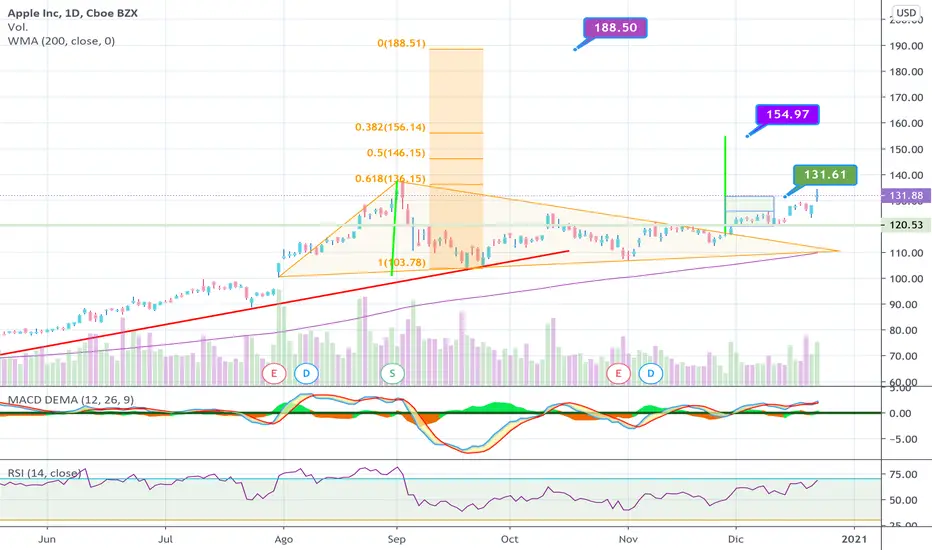 APPLE ya cumplió su objetivo más cercano por doble suelo. Le quedan pendientes ahora otros 2, el más cercano hacia 155$ por ruptura de triángulo, y el de más largo plazo, el impulso fibo 188,50$. A partir de 136$ entraría en subida libre. Soporte MM200 en 110$