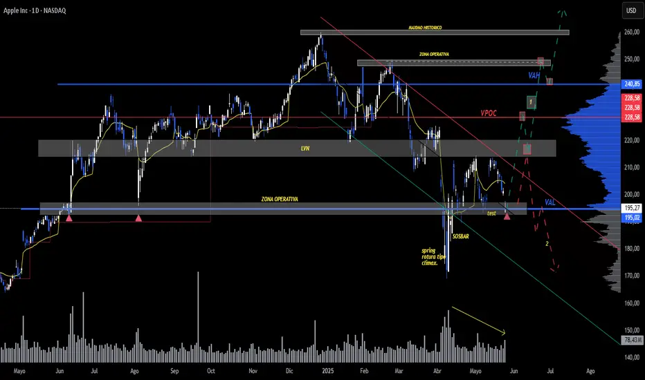 AAPL se encuentra en una zona crítica de decisión, donde convergen factores técnicos y fundamentales. La respuesta del precio frente al nivel del LVN, y la reacción de volumen en próximas sesiones, definirán si nos encontramos frente a una acumulación efectiva previa a un cambio de tendencia, o si se consolida la continuación de la estructura correctiva bajista.