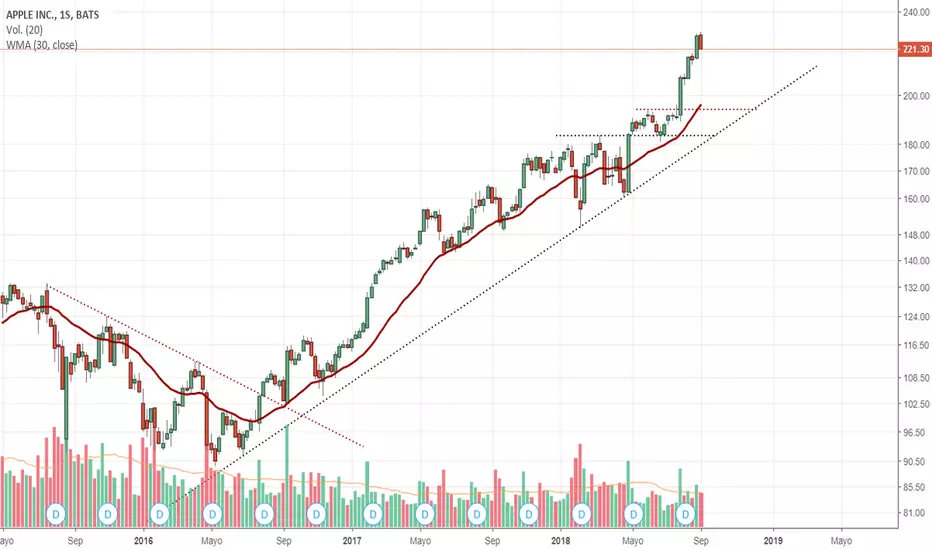 Personalmente esperaría a que el precio corrija hasta alcanzar al menos la WMA, donde seguramente será un buen momento para pensar en comprar. Por ahora, se mira de afuera o se shortea (si es que tienen cuenta para operar en USA).