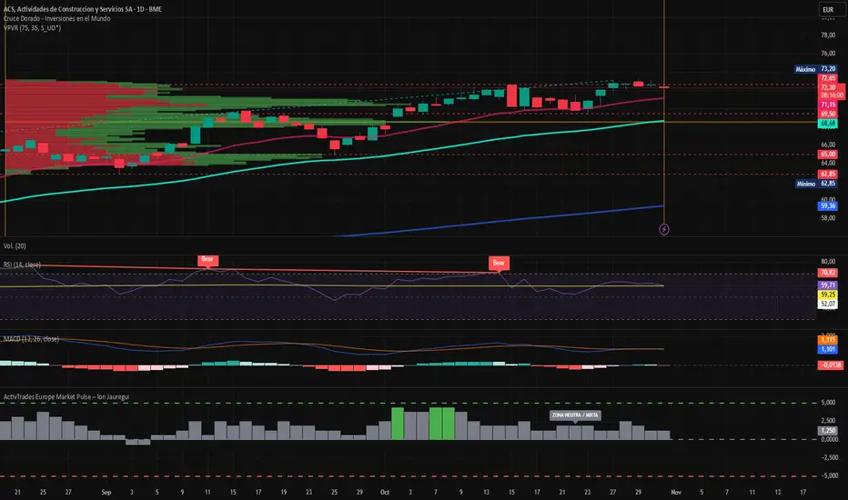 El RSI, actualmente en 61,6 puntos, sugiere una ligera sobrecompra saludable, compatible con la continuidad de la tendencia, mientras que el MACD se mantiene en fase de lateralización positiva, sin señales de divergencia bajista. Por su parte, el punto de control (POC) de la estructura volumétrica se sitúa en 68,50 euros, actuando como soporte dinámico de referencia, con una zona de congestión secundaria en torno a los 71 euros, donde se concentra la mayor actividad reciente.