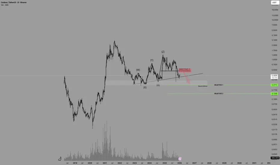 Cardano (ADA) se encuentra en un momento decisivo. Tras la formación de una estructura de máximos decrecientes (pivotes X, Y, Z), el precio ha roto la directriz alcista que sostenía el movimiento previo. Actualmente, el activo está buscando liquidez en niveles inferiores.