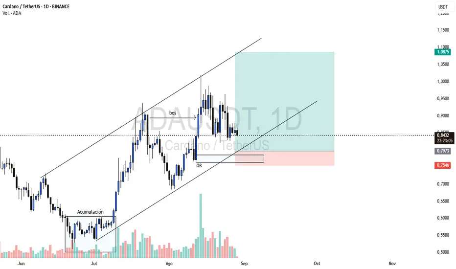 Observamos un canal alcista formado después de una acumulación de precio, además del volumen que observamos y un order block previo sin mitigar por lo que buscamos una compra a largo plazo