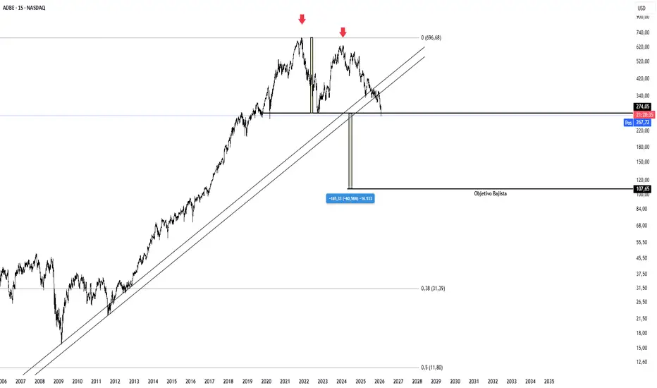 Tras años de tendencia alcista sólida, Adobe muestra signos claros de distribución en la parte alta del ciclo.
