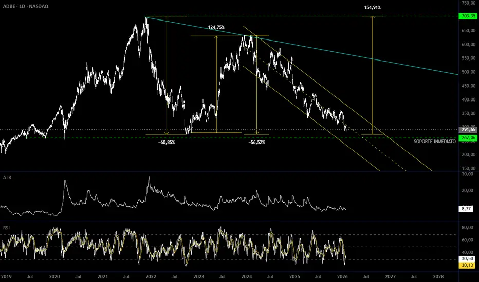 Viene perdiendo mucho terreno (al rededor de 60% desde máximos), su llegada a soporte con ATR bajo por ahora, quiere decir que todavia no hay intensión de pelea entre compradores y vendedores (y por ahora no se sabe cuando la habrá), pero debemos mirar bien que en el anterior soporte de octubre 2022 tampoco hubo un ATR alto, donde rebotó subiendo un 125% (aprox).