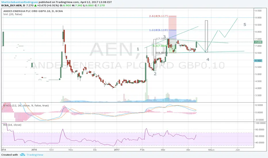 Desarrollándose la onda 4 de elliot formando un banderín con 3 ondas dentro de la onda 4 podemos tener un quiebre de la directriz o nuevamente una corrección haciendo otra onda 4 dentro de la onda 4 para tomar aún mayor impulso hacia el norte. Stop loss 6,45$ Objetivo 8,10 y 8,5 arox. Si repite el mismo movimiento que se inició el 15 de febrero del 2016 podemos llegar a ver el precio hasta 9 pesos.