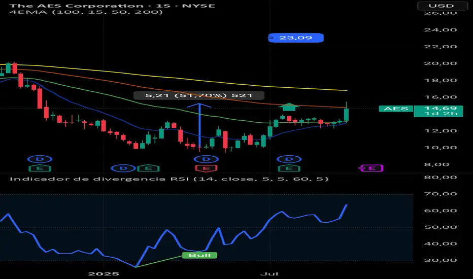 AES a punto de romper rango en gráfico semanal, la ruptura de 15 US$ abre la posiblidad de una extensión del movimiento de un 50%, lo que la llevaría a un próximo objetivo de 23 US$
