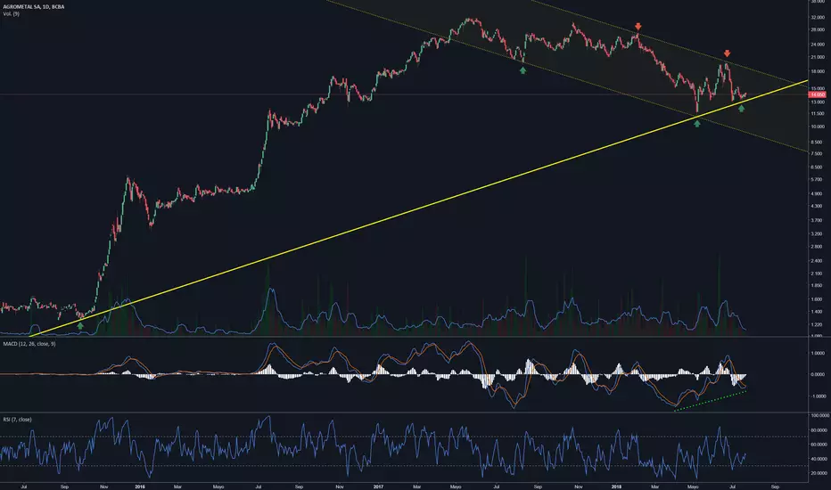 AGRO se encuentra cotizando entre el soporte de largo plazo y el canal descendente. El gráfico se muestra en escala logarítmica.