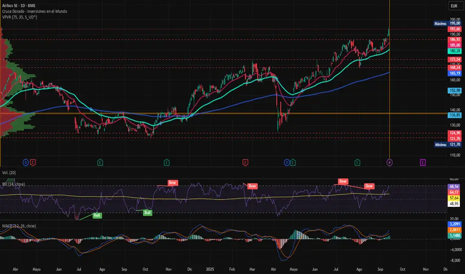 Las acciones de Airbus mantienen una tendencia alcista de largo plazo iniciada en octubre de 2022, desarrollándose dentro de un canal ascendente que ha respetado la media móvil de 200 sesiones. El jueves alcanzaron un nuevo máximo en 195 €, para cerrar el viernes en 193,66 €, tras perforar con fuerza la resistencia clave de los 186,92 €. La expectativa de largo plazo es de una continuación dirección a los 200 euros.