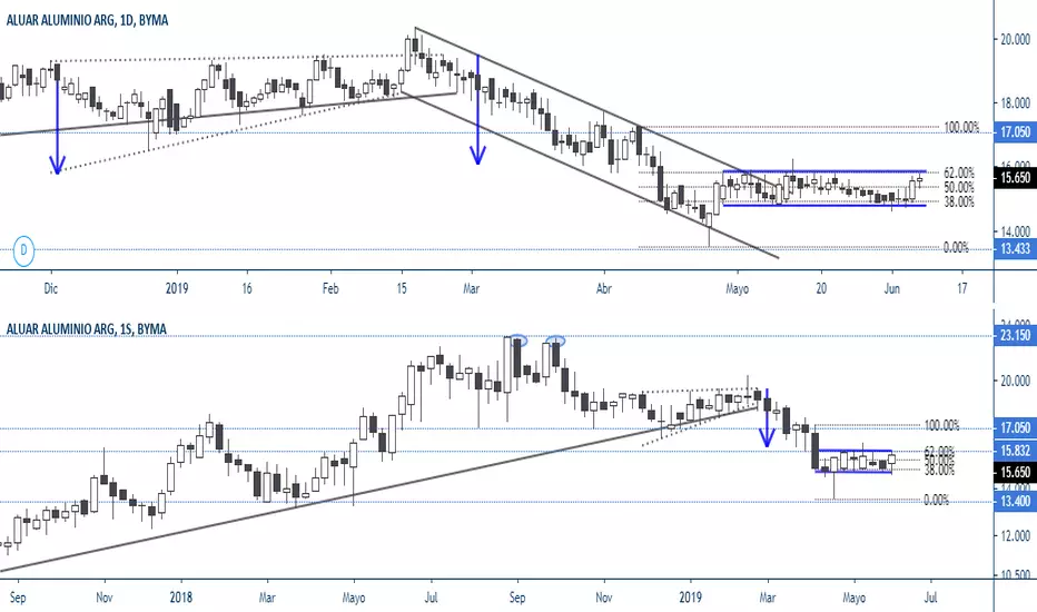 Tanto en velas diarias como en velas semanales se advierte un proceso de acumulación dentro de una tendencia lateral, el canal está delimitado por los $14.8 - $15.8 que también es coincidente con los niveles de retroceso de Fibonacci en 38%- 62%.