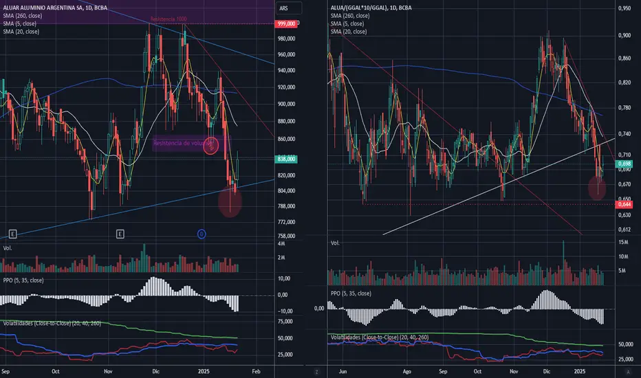 Aluar en pesos y en dólares (CCL). Dada su volatilidad, su precio en dólares y la media de 260 es una buena oportunidad para acumular.