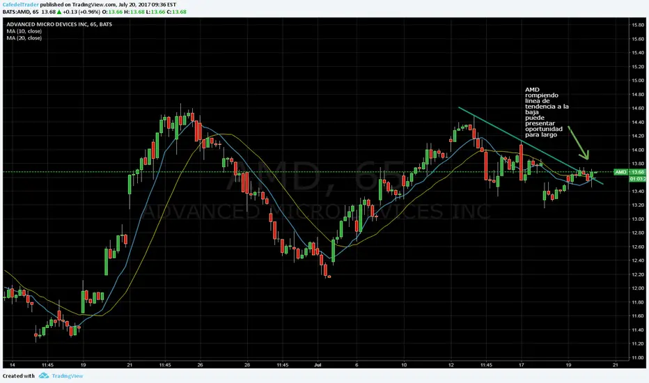 AMD que ha sido una acción tan de moda como NVDA por su produccion de GPU's hoy rompe linea de tendencia de baja lo cual pordría marcar nuevamente movimiento a la alza