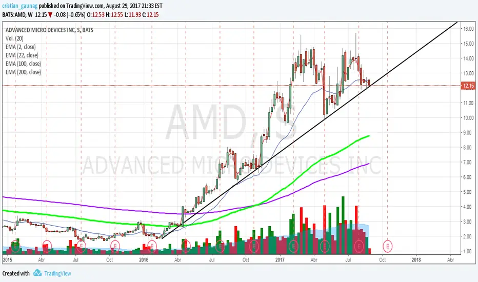 AMD (empresa del exterior) se encuentra próximo a la línea de tendencia principal de largo plazo por lo que podría dar una oportunidad de trading alcista asumiendo bajo riesgo ya que se puede colocar un stop loss de bajo % de pérdida en caso de que la acción no rebote al alza en la línea de tendencia marcada.