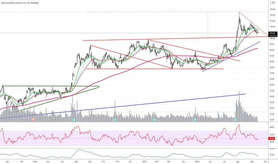 Presentó balance y disparó vertical. Se salió de la formación rectangular, desdobló y se cae. Con este firme ajuste queda atrapada dentro de una formación triangular a definir. Todo demasiado rápido para arriba como para abajo que no convence y hasta espanta. AMD pertenece al 2° pelotón de las tecnológicas que alcanzaron niveles superiores a esperados. Fabrica microcomponentes de altísima demanda mundial que escasea en la industria. Tiene suficientes argumentos fundamentales y técnicos como para seguir subiendo, pero antes tie-ne que definir su rumbo.