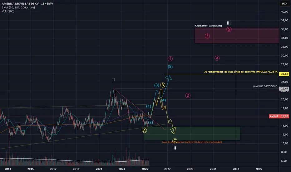 ESCENARIO 1 (el - optimista). Representado con un "ABC" en color amarillo; se sugiere que estamos en curso de la onda "B" con lo que deberíamos de ver una revalorización en el precio de la acción. Cuando esto termine el precio debería volver a caer para completar la onda II, representada con los números romanos en color blanco "I, II, III, IV, V". La línea amarilla que dibujé con la herramienta plumón representa mas o menos lo que se espera el precio haga bajo el presente escenario. Si observas bien por ahí hay otro pedacito de línea naranja, representa una desviación más alcista de la acción del precio. Bajo este escenario hay una zona de acumulación que estará entre los $10.70 - $13.75 MXN. Toma en cuenta que terminando la onda II sigue la III.
