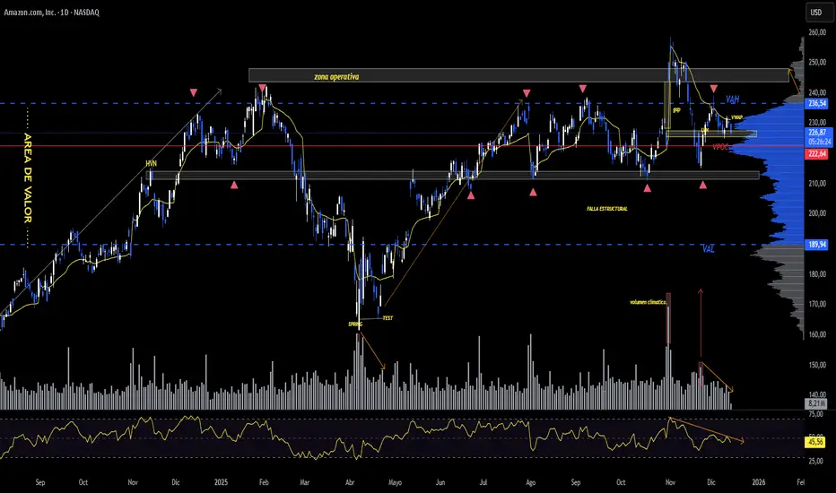 El gráfico muestra una evolución muy clara dentro de una estructura de rango expandido, donde el precio ha alternado fases de acumulación y redistribución, con un HVN central que funcionó como “eje de valor” en la mayor parte de 2025.