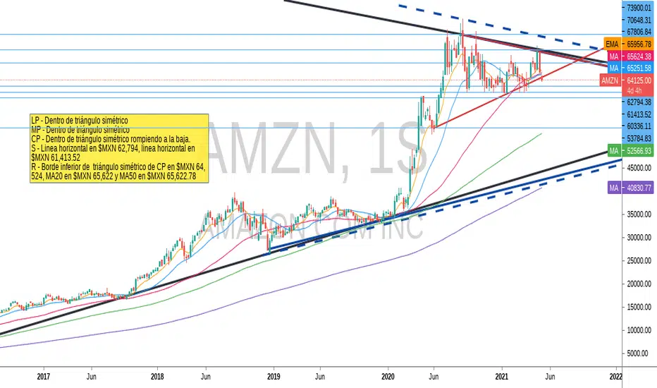 R - Borde inferior de triángulo simétrico de CP en MXN 64,524, MA20 en MXN 65,622 y MA50 en MXN 65,622.78