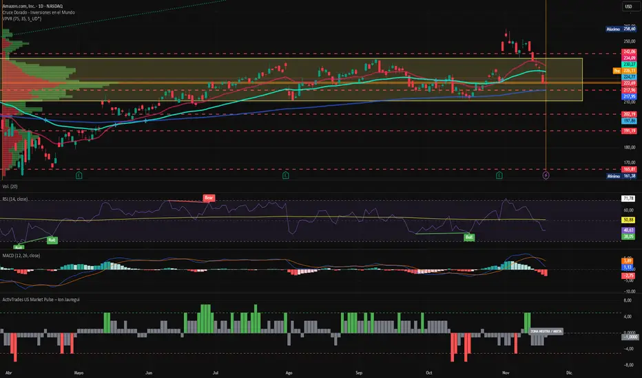En gráfico diario, AMZN muestra un comportamiento lateral tras la corrección marcada durante noviembre. La sesión del miércoles cerró en 222,69 USD, nivel que coincide con el punto de control (POC) del volumen, actuando como referencia estructural del rango.