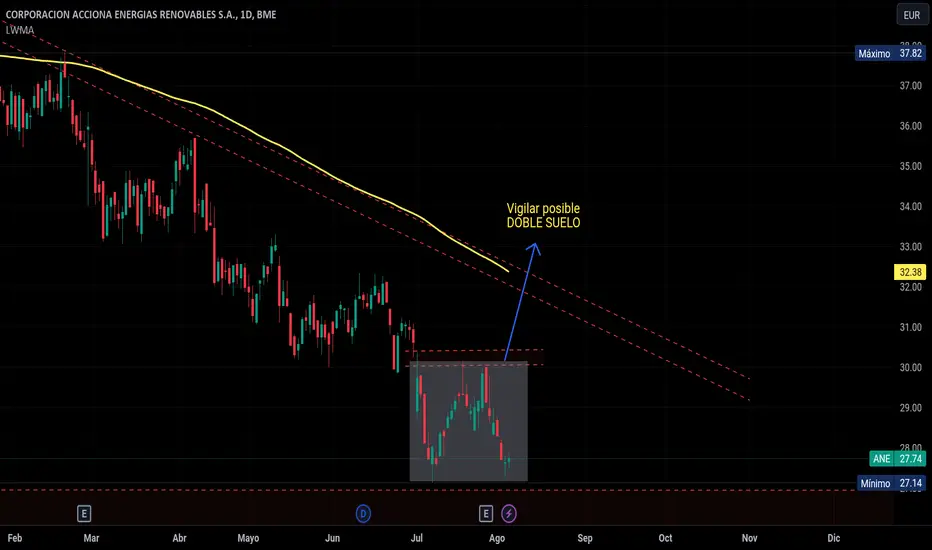 Tras caídas importantes, ANE está formando un gráfico de doble suelo que podría confirmar en breve. Entrada inmediata (más riesgo) o por encima de 30, cuando activaría la figura.