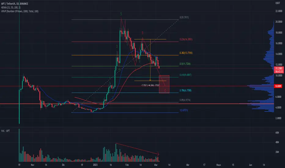 La criptomoneda Aptos, ticker APT, hizo un movimiento de 5 ondas impulsivas desde fines de diciembre hasta fines de enero del presente, subiendo de manera impresionante de los $3 dólares a los $20 dólares aproximadamente. Es una moneda mediana, antes chica, con valor de capitalización de $1.8 billones de dólares.