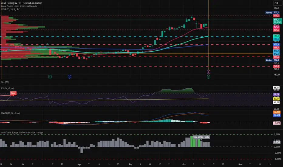 En el plano técnico, las acciones de ASML cotizan hoy entorno a los 874 euros por acción manteniéndose cerca de sus máximos históricos en 905,1, impulsadas por la euforia de la inteligencia artificial. El valor ha mostrado una tendencia alcista sostenida desde inicios de año, con soporte clave en torno a los 804 € y resistencia inmediata en la zona de 960 €. RSI se encuentra en zona de sobrecompra en 67,15% indicando un aumento del momentum comprador en el inicio de sesión. Por otra parte MACD señala lateralización con un histograma en territorio negativo en proceso de corrección. Los cruces de medias mantienen el precio por encima de la media de 50 por lo que parece un claro soporte para realizar un nuevo intento de perforación en máximos.