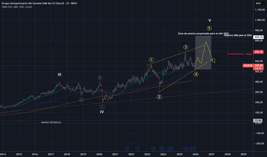 1.- Hay buen pronóstico para ASUR/B para este 2026 coincidiendo mi perspectiva claramente con la de ellos. Desde el análisis para el año 2025 ya veníamos sospechando de una "cuña" bajo el ESCENARIO 2, sin embargo toda la "data" que se generó durante este mismo año, nos ayuda bastante a ir esclareciendo gráficamente la identificación de esta estructura. A pesar de que se va dibujando una cuña, se le ve con fuerza y volumen, esto ayudará mucho en la resiliencia futura que deberá tener esta empresa cuando le llegue su momento de corregir (en ciclo).
