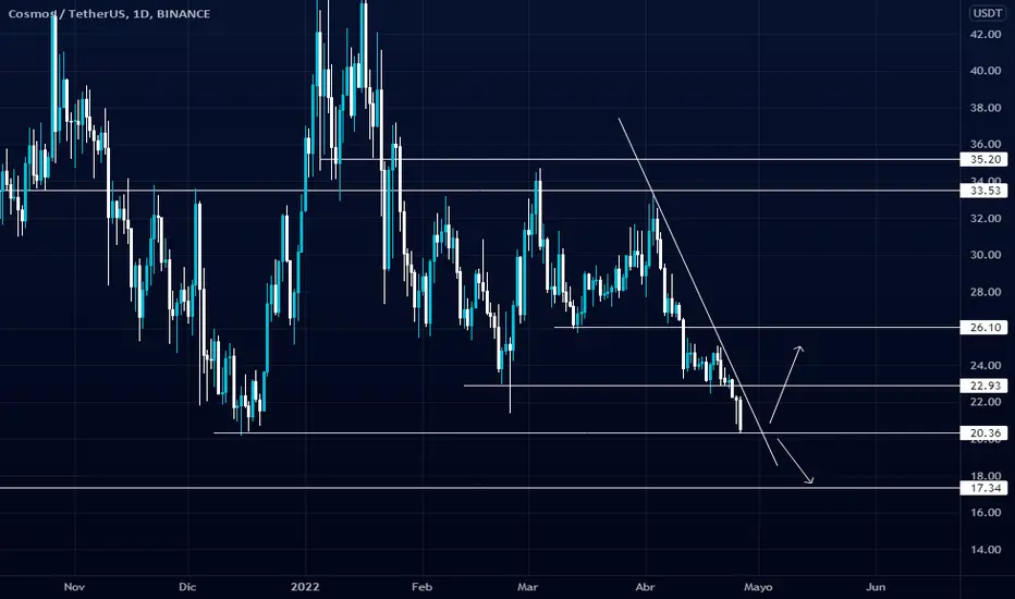 El precio de ATOM ha presentado un fuerte descenso las últimas horas, la superación de la barrera de los 20.36 dólares supone una continuidad con objetivo alcanzar el precio de los 17.34 dólares.