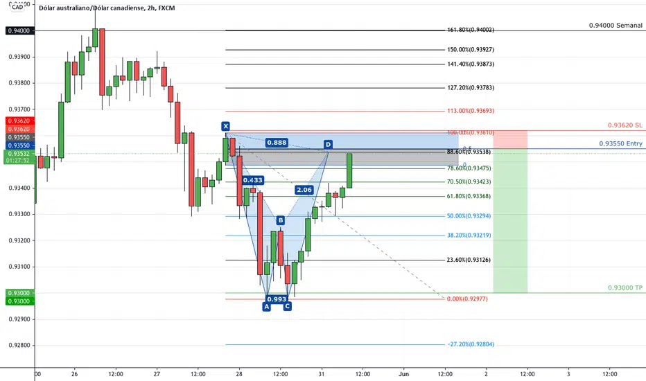 Hola traders, hoy traigo un análisis en el Audcad que se encuentra en zona de ventas, y viene buscando una zona en la cual se encuentra un OB y adicional a eso confluye con un patrón armónico, de manera que la entrada es muy probable, y se tienen pocos pips de Sl, con un riesgo-beneficio de 1:7,86 lo cual hace que valga totalmente la pena el ingresar a la operación. Es probable que el precio baje a partir de este nivel ya que la zona del OB superior ya fue capitalizada, sin embargo este último OB aún no.