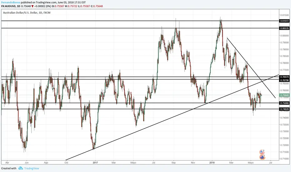 En este caso vemos como el par sigue en zona de nadie, pese a que nos dio unas oportunidades de compra la semana anterior a la que para quienes las tomaron se les pudo cosechar varios puntos en nuestro favor, sin embargo, esta semana tenemos la decision de tipos de intereses en Australia, por lo que tanto en este par como en todos los que involucren el dolar australiano debemos tener precauciones adicionales. De momento, preferiría esperar a que el precio visite alguno de los trazos que tenemos en el gráfico.