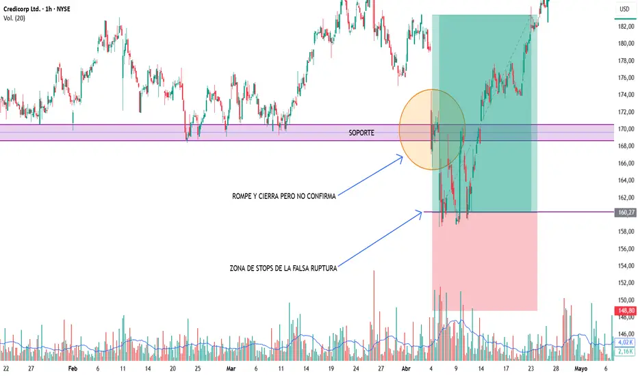 En el gráfico vemos una zona de soporte marcada con un rectángulo púrpura. Una vela potente de gran cuerpo y volumen rompe el soporte y la siguiente vela no confirma esa ruptura, estamos ante una falsa ruptura.