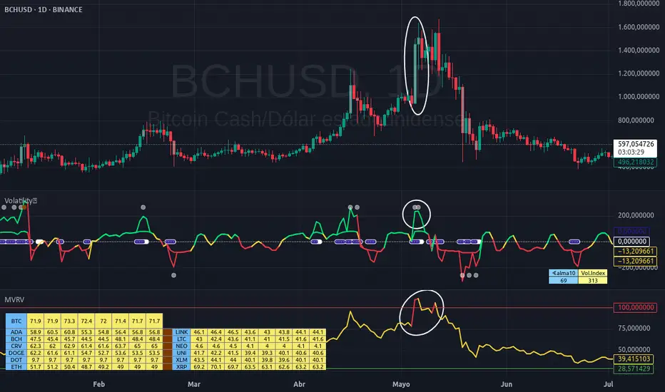 Este modelo puede servir como marco educativo para interpretar futuras fases especulativas en altcoins. En este ejemplo gráfico se ilustra cómo detectar comportamientos extremos mediante indicadores técnicos.
