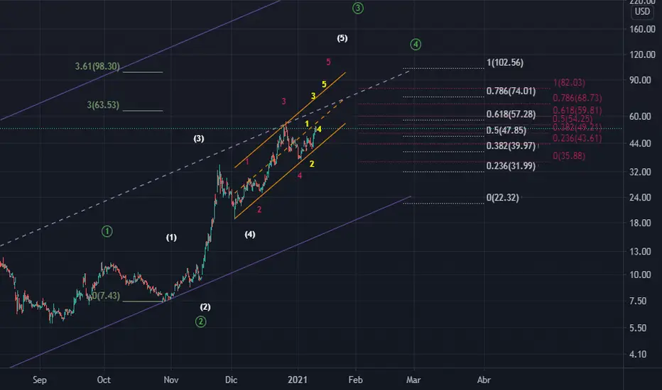 BLNK ya cumplio objetibo anterior, ahora se presenta la ultima onda 5 de 3 de grado mayor. Es de esperar objetivos cercanos a 63 donde hay clusters de distintos TF. Como muy ambicioso puede llegar a 75. Es un ejercicio practico utilizando ondas de elliot, no es recomendacion de operacion.