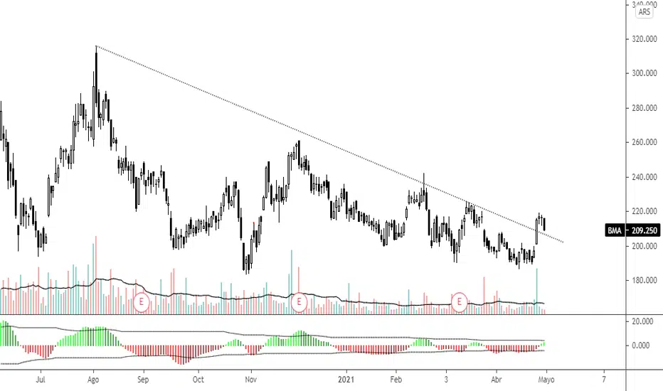 Banco Macro quiebra la línea de tendencia bajista que trae desde los máximos de agosto del año pasado, con fuerte incremento de volumen y luego retrocede con caída de las operaciones. Mientras no pierda los 205 pesos, estamos en presencia de un throwback que confirma el quiebre de la resistencia dinámica mencionada.