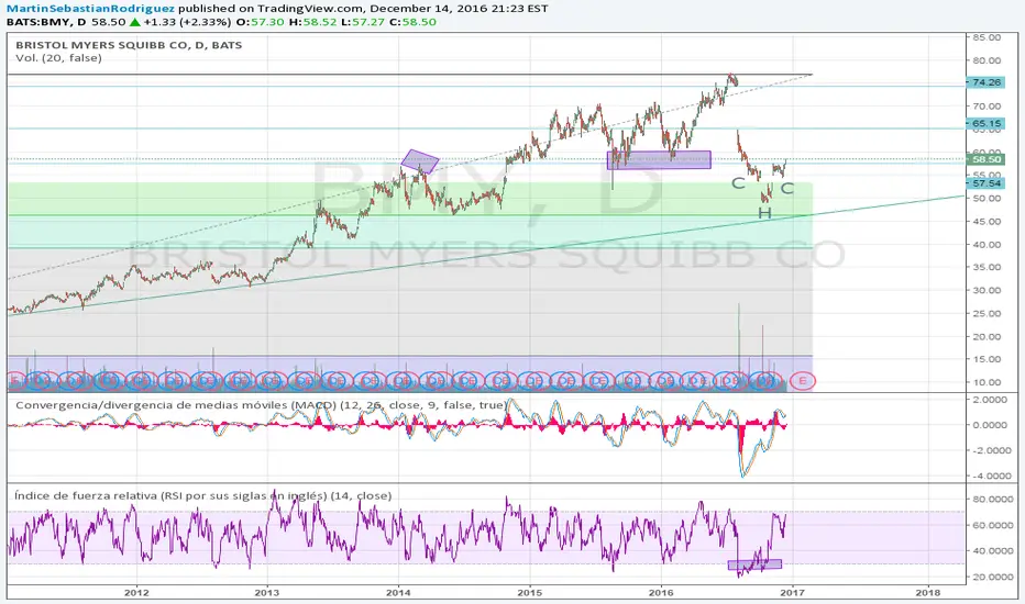 Después de hacer agua con sus investigaciónes la empresa retomará la senda alcista. La señal la da directamente el precio con HCHi en la zona de los 50$ con un fibbonacci en el cual el precio se apoya en el 50% de los retrocesos. El MACD y un RSI totalmente divergentes.