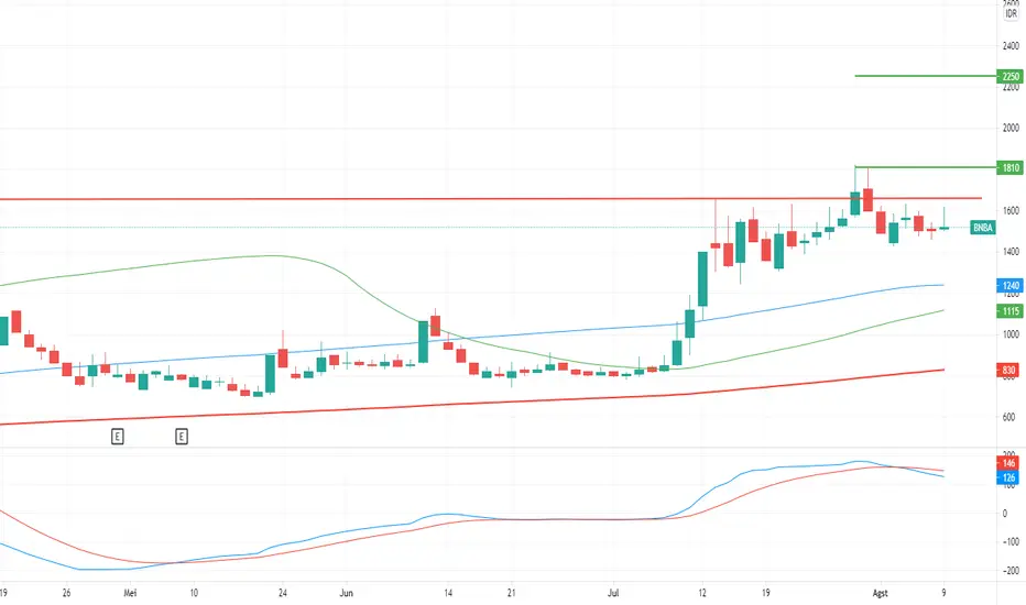 BNBA berkonsolidasi menguji kembali area resist linenya. Jika kedepannya saham ini mampu menembus level resisten 1630, maka terbuka peluang kenaikan kembali bagi BNBA menuju 2250 dengan minor target 1810. Harga yang berada diatas rangkaian moving averagenya menunjukan saham ini berada dalam trend kenaikan jangka menengah - panjang.