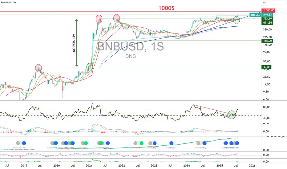 El gráfico que se muestra a continuación presenta las velas semanales del BNB/USD. Si observamos el invierno de 2021, vemos que la ruptura del ATH coincidió con el inicio de la temporada de altcoins.