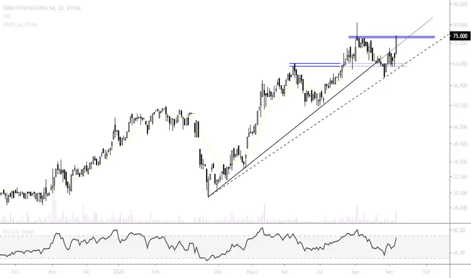 Muy bien hoy este banquito, mucho volumen con una suba muy fuerte. Logró romper el primer nivel de 70 pesos y fue directo al próximo en los 74.10/74.80. Superando este último queda muy bien de fondo nuevamente y corta la idea de pausa o corrección y además podemos esperar una continuación hasta los 81 y luego 87.