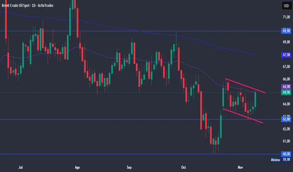 Esta media móvil ha actuado como una resistencia dinámica para el Brent —y de forma similar para el WTI—, limitando los intentos de avance durante las últimas semanas. No obstante, el patrón técnico que se observa en la gráfica sugiere la formación de una bandera alcista, una figura que generalmente anticipa la continuación de la tendencia previa, en este caso, alcista.