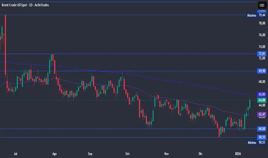 El Brent también confirma una ruptura real por encima de la media móvil exponencial (EMA) de 55 días, la cual estuvo actuando como una resistencia dinámica para el commodity.