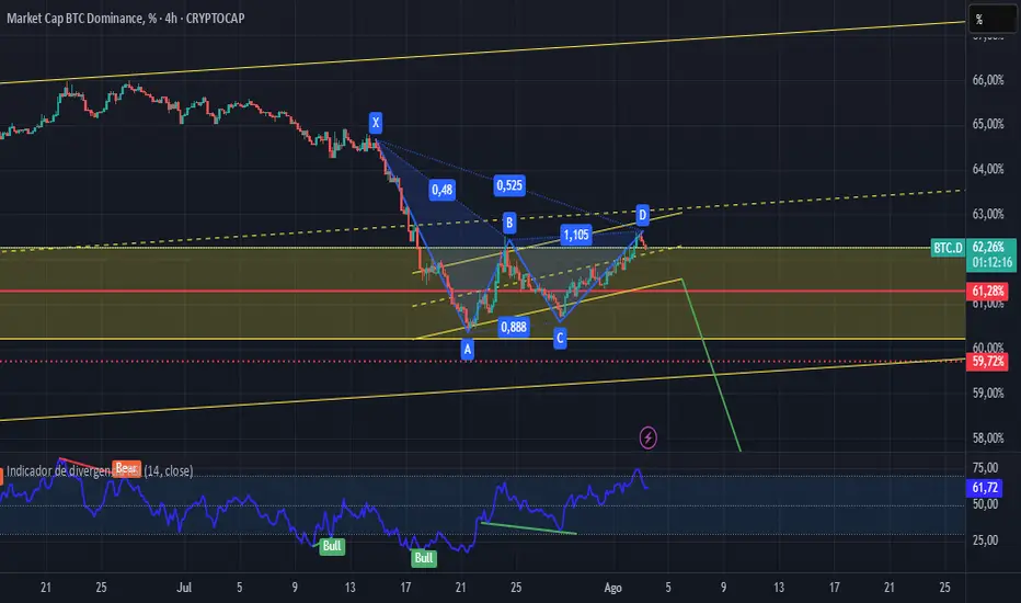 La dominancia de BTC está tocando zona de potencial reversal luego de completar un patrón armónico tipo Gartley, clavando los puntos con precisión quirúrgica 🩻