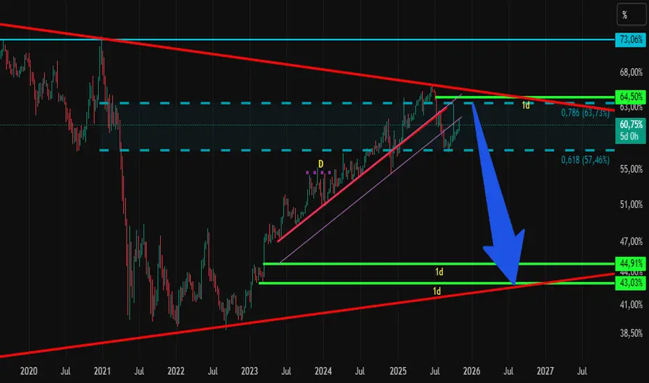 Podemos apreciar la dominancia como sube como la espuma y junto con ésta la caida del ponzi salvador del mundo BTC, las altcoins muriendo a niveles asquerosos. Basandome en graficas sin fundamentales chantas la dominancia de btc deberia llegar hasta el 65% antes de su caida y junto con ella el posible respiro o ultimo suspiro de las shitcoins? cayendo hasta 43%, estos niveles viendo el triangulo formado en semanal desde el 2022.
