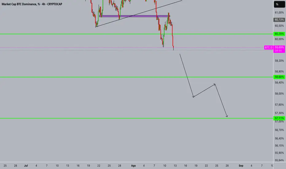 claramente el mercado sigue cayendo, así que mientras siga rompiendo las zonas verdes marcadas, este mercado seguirá cayendo y por lo tanto seguirá dominando la fuerza alcista de las altcoins.