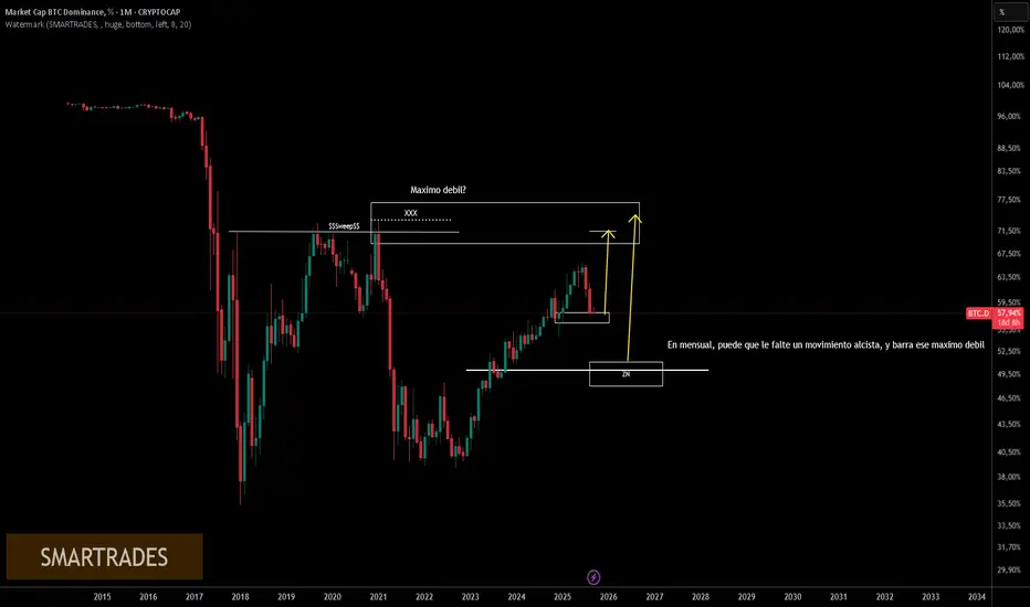 Comparto mi vision de la dominancia de BTC en mensual, la zona en la que se encuentra ahora es de peligro de rebote, pero marco una zona mas abajo que me parece aun mas peligrosa, no creo que este retroceso vaya por un nuevo minimo (ALTSEASON) creo que le queda un impuslo mas. marco como zonas de reaccion la zona actual y la zona marcada con rectangulo blanco mas abajo.