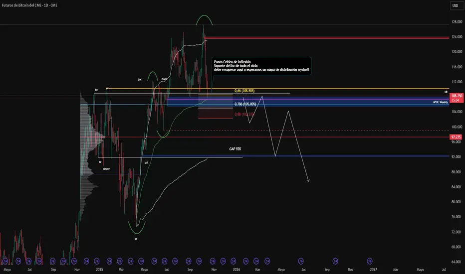 BTC se encuentra en un punto de inflexión crítico tras la caida fuerte, necesita recuperar rapidamente la zona de S/R, de lo contrario entrará en un ciclo de distribución de mapa de ruta Wyckoff. Es un punto en el cual se debe monitorear de cerca.